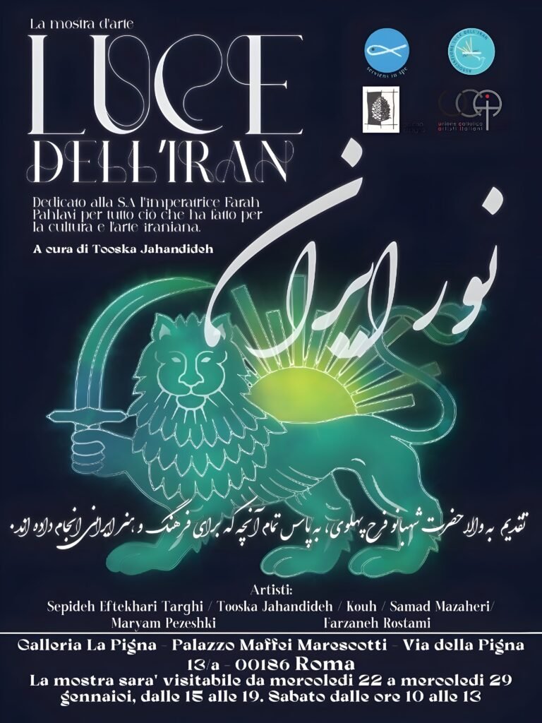 انجمن نور ایران نمایشگاه هنری با عنوان «نور ایران» برگزار کرده است تا فرصتی برای هنرمندان ایرانی فراهم کند، به ویژه آنهایی که به دلیل شرایط اجتماعی و اقتصادی در ایران از تجربههای بینالمللی محروم بودهاند. در این نمایشگاه، هنرمندان ایرانی مقیم کشورهای آزاد نیز حضور دارند. همچنین، این نمایشگاه به پاس اقدامات فرهنگی شهبانو فرح پهلوی و تأثیر او در رشد هنر در ایران، به ایشان تقدیم شده است. از جمله دستاوردهای فرهنگی دوران پهلوی، موزه هنرهای معاصر تهران است که به دست شهبانو فرح پهلوی تأسیس شده و به عنوان یکی از مهمترین مراکز هنری در ایران شناخته میشود. در برگزاری این نمایشگاه جا دارد از انجمن سن وینچنزو دی پائولی، گالری پینیا و انجمن نقاشان کاتولیک ایتالیا که در بهتر برگزار کردن نمایشگاه ما را همراهی کردند قدردانی میشود.